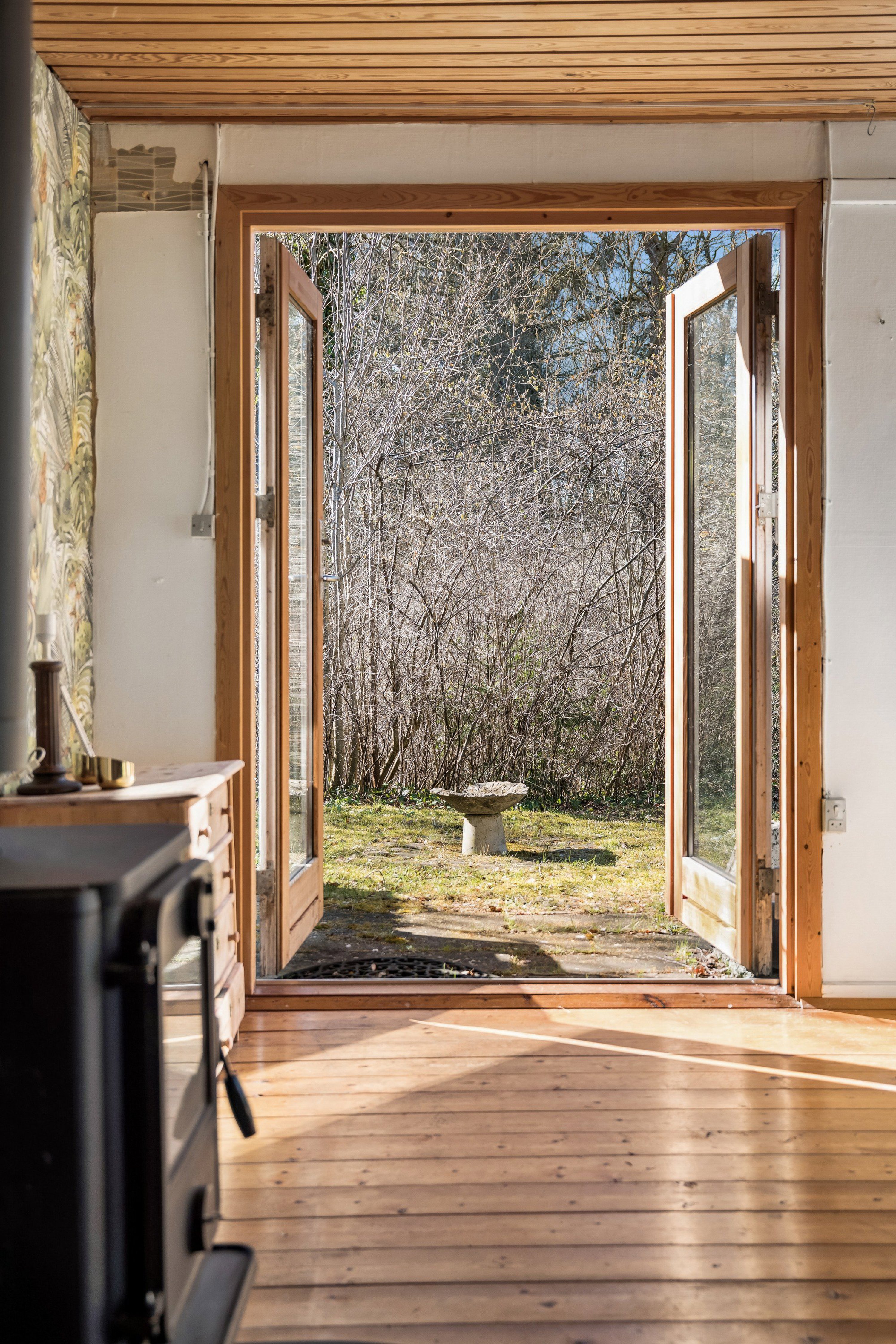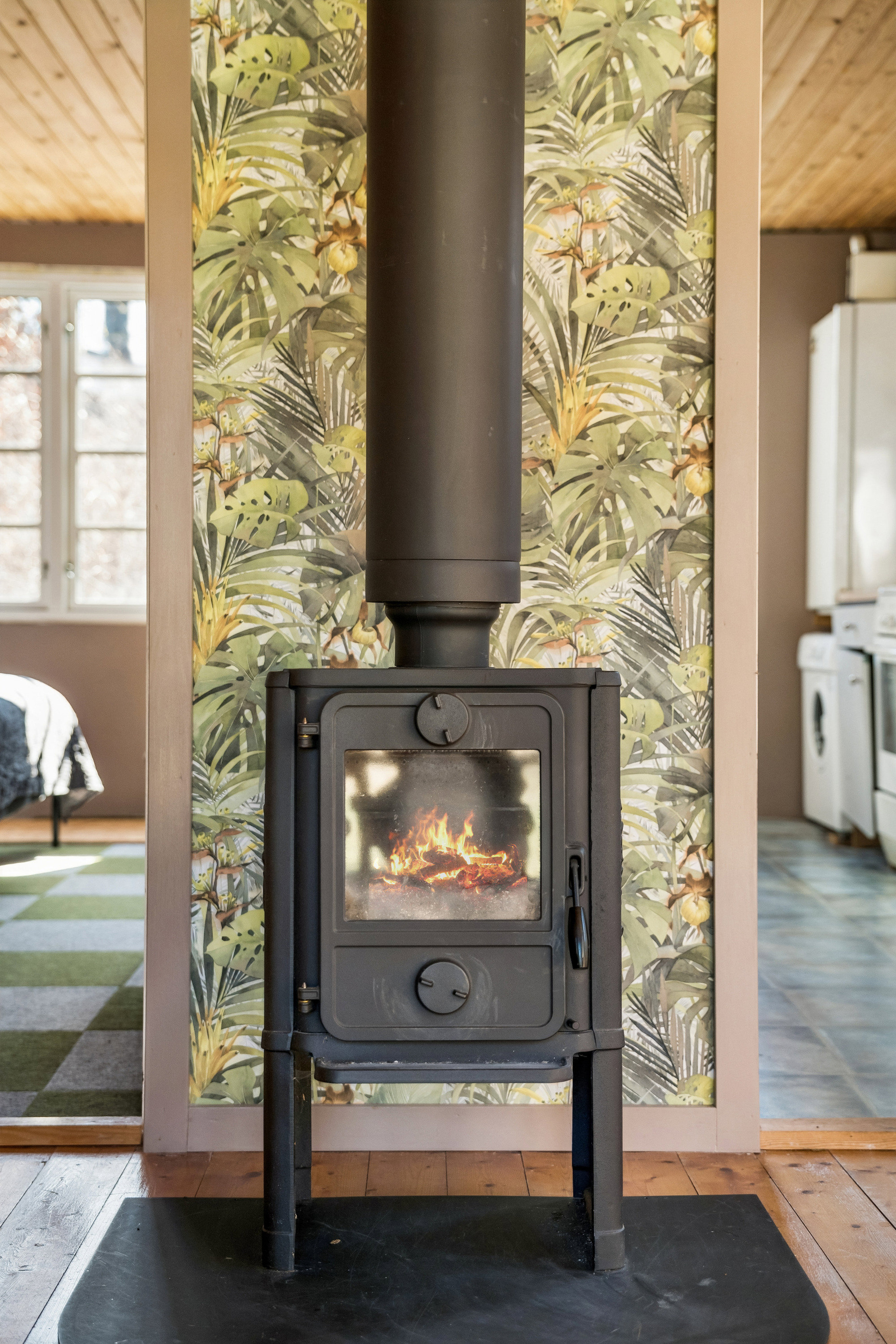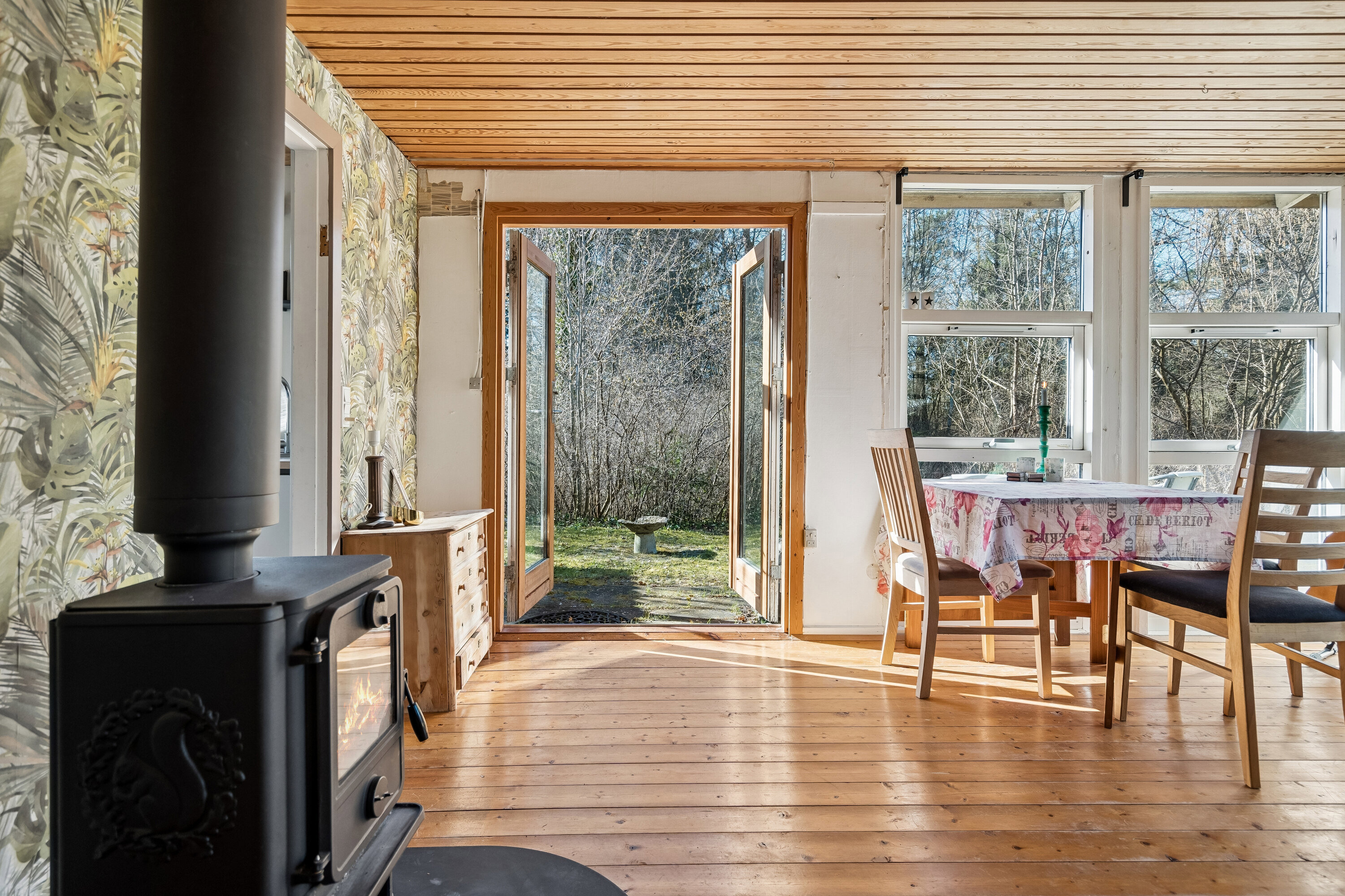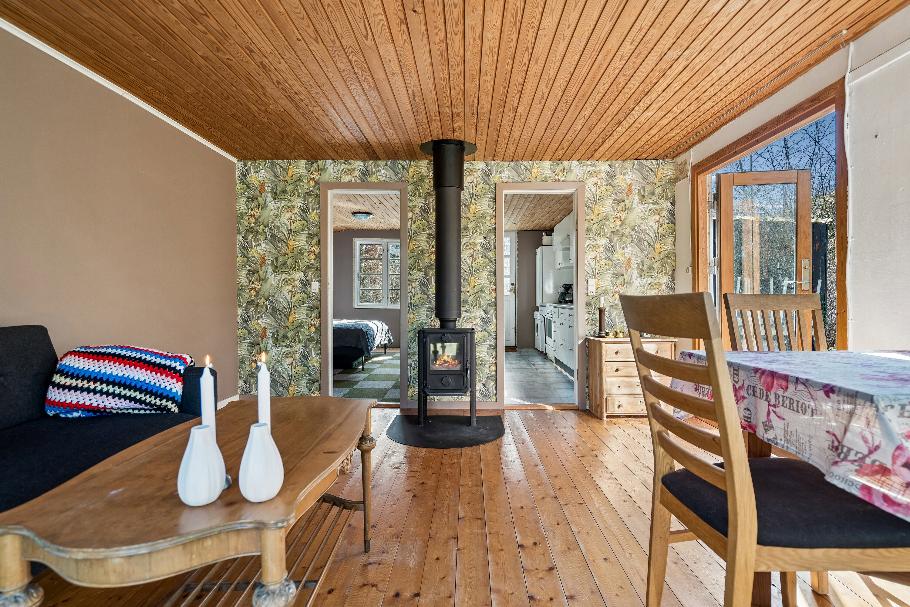 Huset byder på 48 veludnyttede kvadratmeter og rummer alt, hvad I har brug for til afslapning og kvalitetstid. Indenfor mødes I af en lys og indbydende stue med brændeovn, der skaber en varm og hyggelig atmosfære året rundt – perfekt til kølige aftener med familie og venner. De store vinduespartier giver et skønt lysindfald og en smuk forbindelse til naturen udenfor.